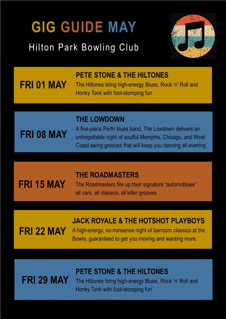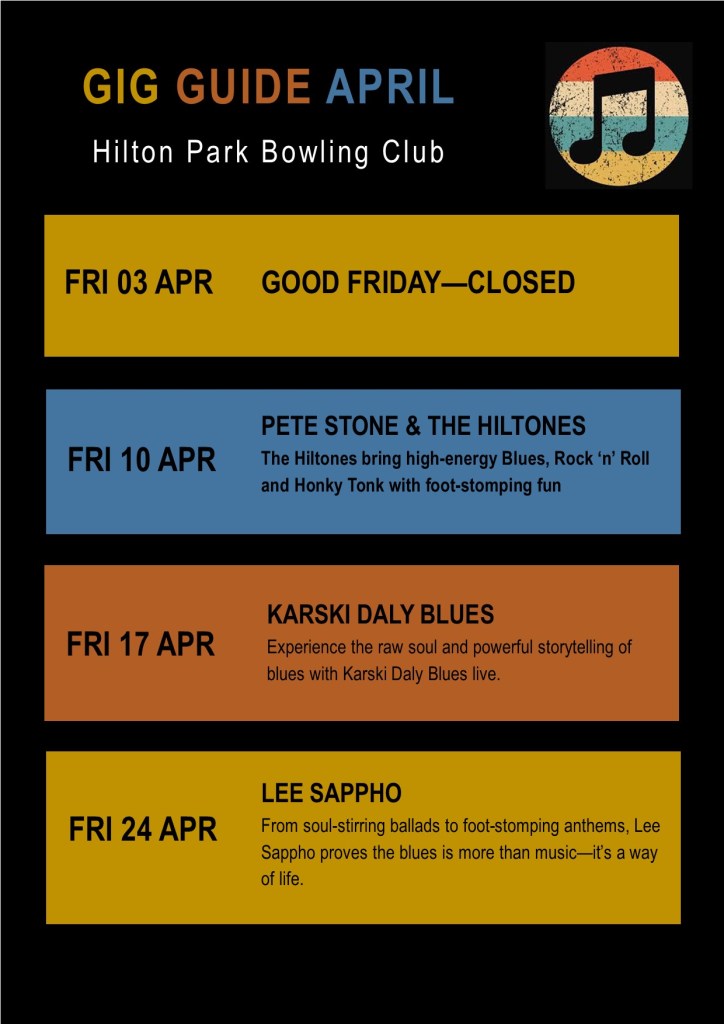 From 4.30 pm to 7:00pm, kick back and soak up the summer vibes with live music at Hilton Park Bowling Club. Every second Sunday during the warmer months, we bring you great tunes, good company, and a relaxed atmosphere.